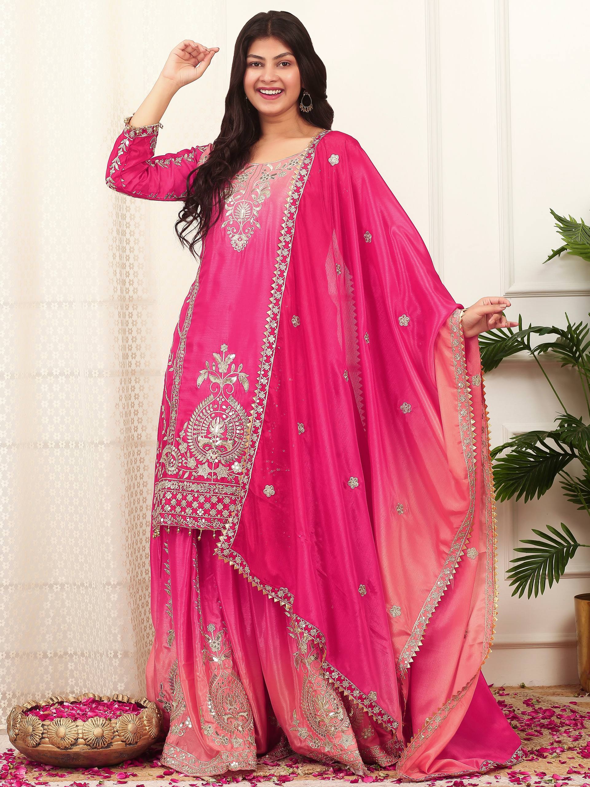 Home » Shop » Pehnava Style Pure Shaded Chinon Silk Embroidery Kurtie Palazo & Duppatta